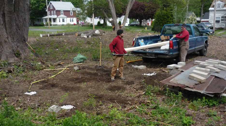 Last Sunday with the generous help of my classmate Thom and his girlfriend Beth we built the bunks that the lumber will be stacked and stickered on. I made my first trip up to Renew Building Materials and Salvage in Brattleboro to get the material for the bunks: 6×6 beams, and cement bricks. On the way home I picked up old metal roofing material from Brett and Guy’s father Craig. The bunks are 9′ 10″ wide by 13′ long.