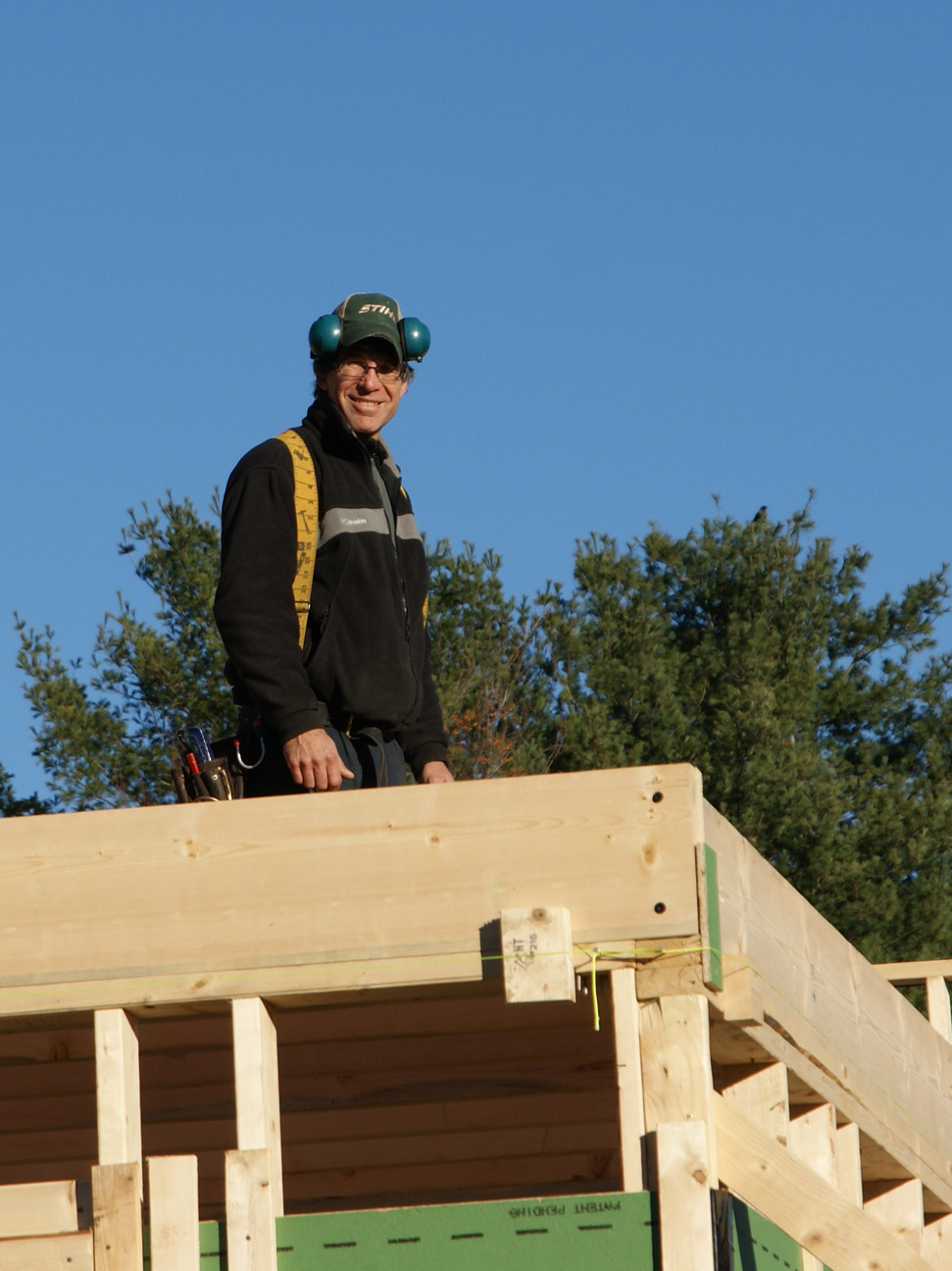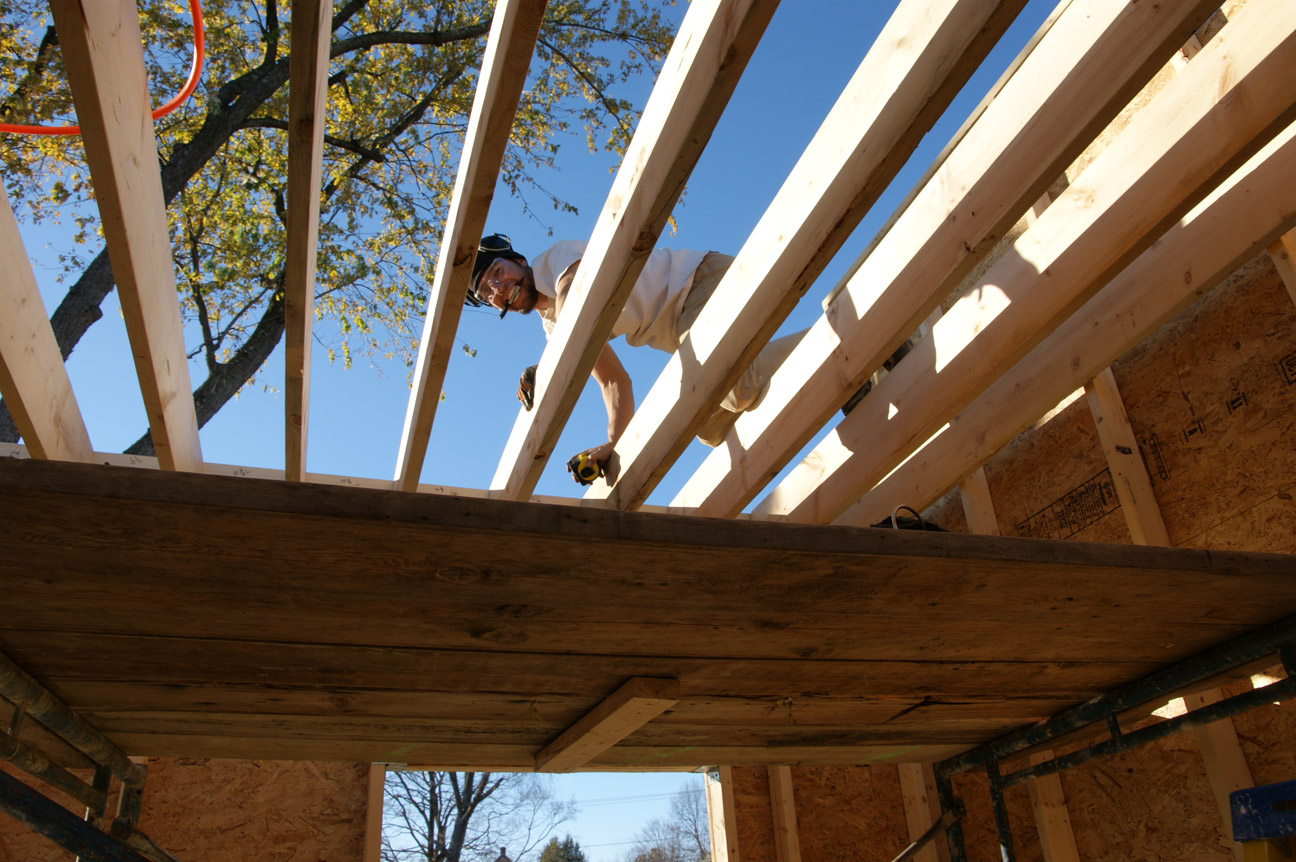 A couple of days ago we put up the interior load bearing wall. Today, we finished putting up joists and blocking, and we are now ready to start putting down the flooring. For the second floor floor I decided to go with tongue and groove 2×6 spruce boards on a diagonal. The boards will be more time-consuming install and costly than a sheet good like OSB or plywood, but it means we won’t need to put down a hard wood floor at $3-5/S.F. Also, sheet goods, especially OSB, has a lot of glue in it, which I would like to avoid putting in our living space.