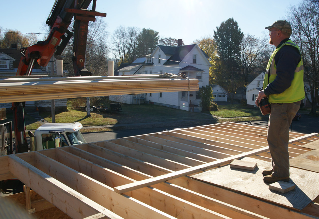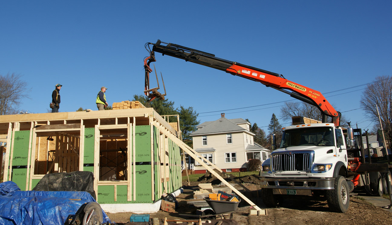 Tongue and groove 2x6 spruce being lifted to the second floor. The machine worked by radio allowing the operator to control the crane form the second floor.