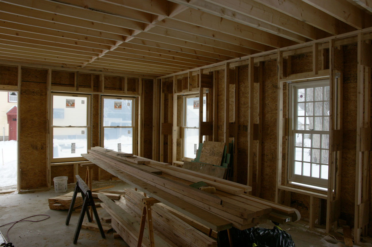 Windows! Before we can install our windows we pay a lot of attention to flashing. The general idea is to prepare for the eventuality that the flashing or the window itself might leak at some point during its life. Therefore, we want the water to drain out the bottom. We begin by tacking a clapboard down onto the window sill creating a positive drain slope to the exterior. Then, we install a piece of flexible stretchy flashing tape that can go continuously around the corners of the bottom. This is called our sill pan and you can see it installed in the window at the right. If we had used a house wrap, its flaps would protect the sides of the window rough opening, however, since we used the Zip system (the green sheathing) we applied 6" flashing tape to the sides of the rough opening. We aren't worried about protecting the underside of the header with tape since water is unlikely to come through the rough opening there, and if it does, it will quickly move down. After we put the window in, we apply 6" flashing tape over the side flanges and then the top flange of the window. It is important not to put any tape on the bottom flange so that the sill pan can drain to the outside. It is also important to note that we did not use any caulk. Although many knowledgeable builders do seal the window to the house with caulk behind the flange, Joe Lstiburek, a renowned building scientist, calls the practice "unnecessary and dumb". The tape, and the spray foam is an adequate seal from air and water.