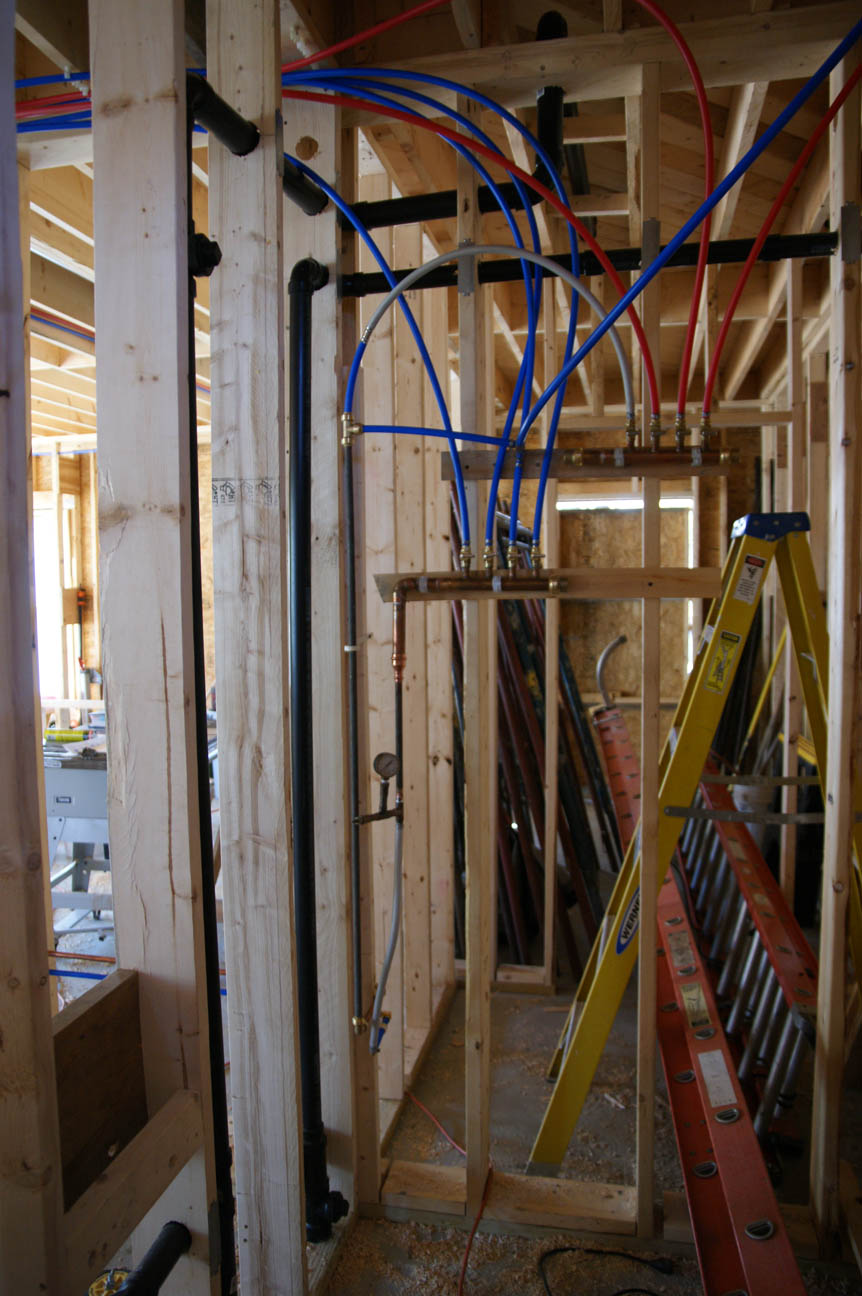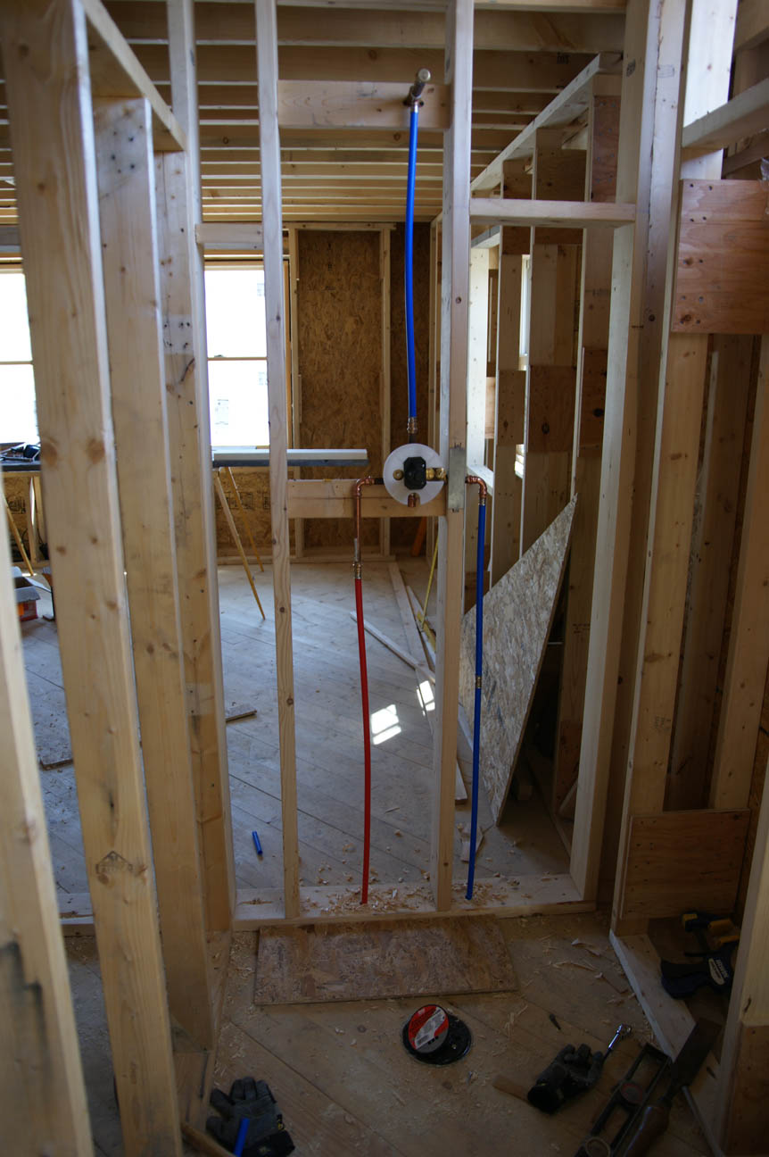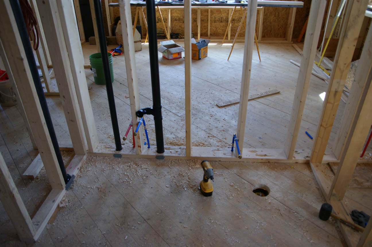 Water line supplies for kitchen and second floor bathroom drain. The standard is to use plastic pex pipe for all water lines--cheaper to buy and quicker to install. However, in the event that we discover that pex leaches some yet-to-be named toxic acronym into our hot water I thought it best that we have at least one copper line in the house.