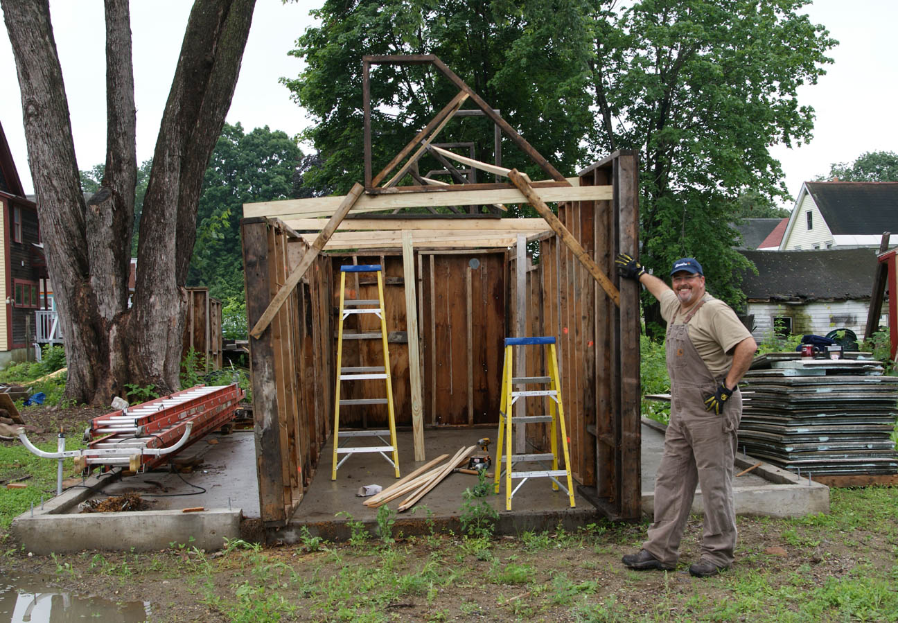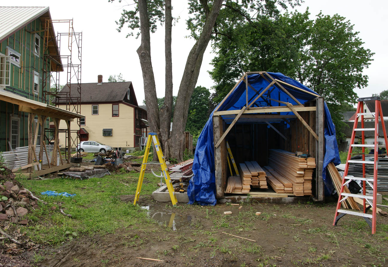 We had a big delivery of wood arrive yesterday: 2700 linear feet of 1×8 tongue and groove boards. We got the wood from County line lumber in Athol. They have great deals on all sorts of building materials. The boards will be used for the underside of the soffit and also much of the interior ceilings. With no place to store the wood, it was time the build the garage. Thom and I finished it in a few hours.