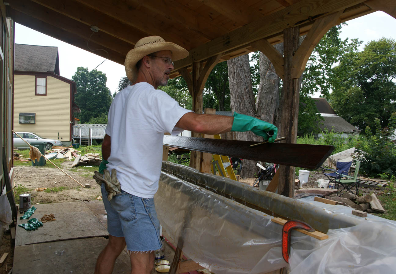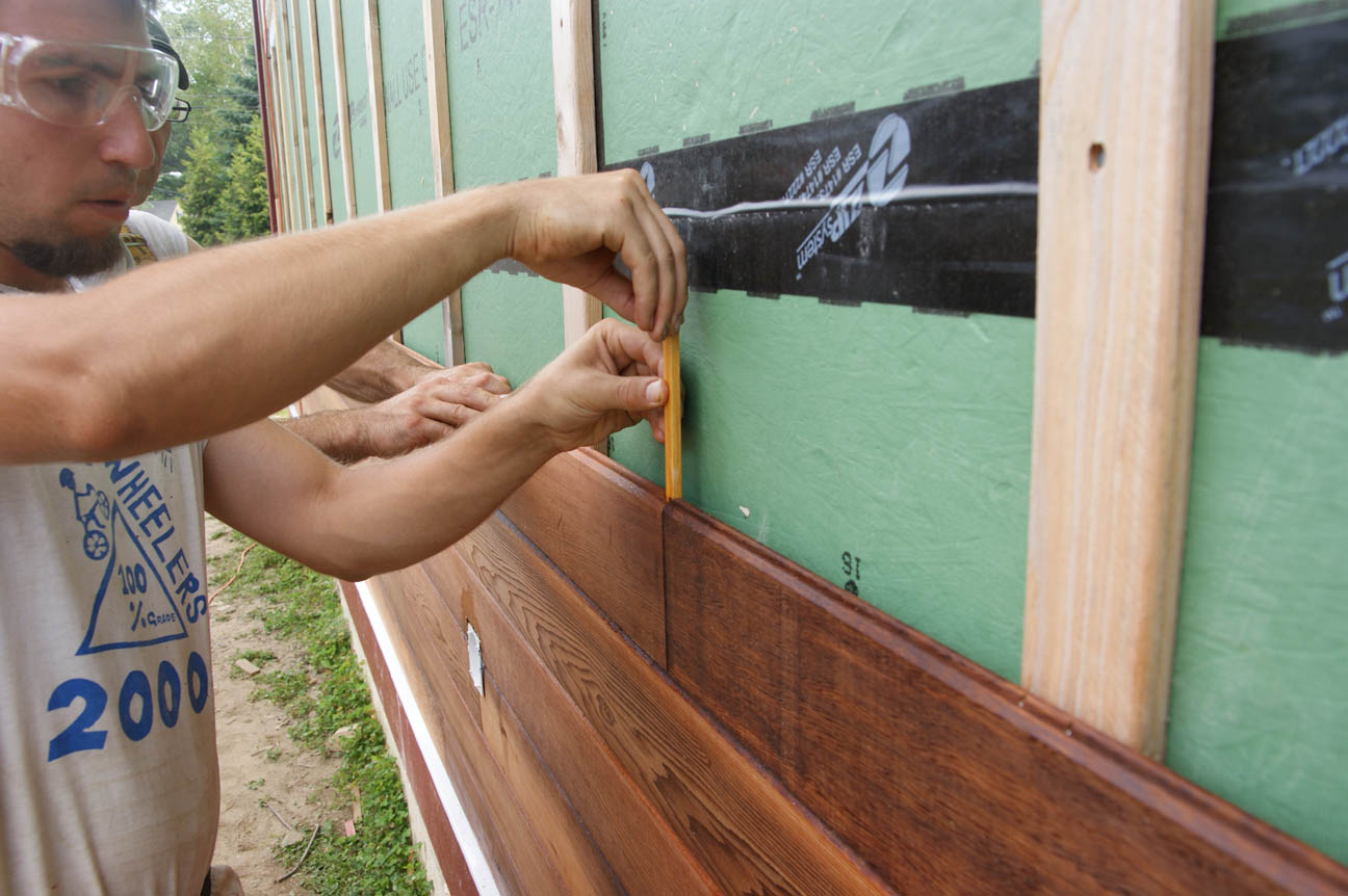 Andy dipping red cedar tongue and groove siding board in trough of Penofin stain