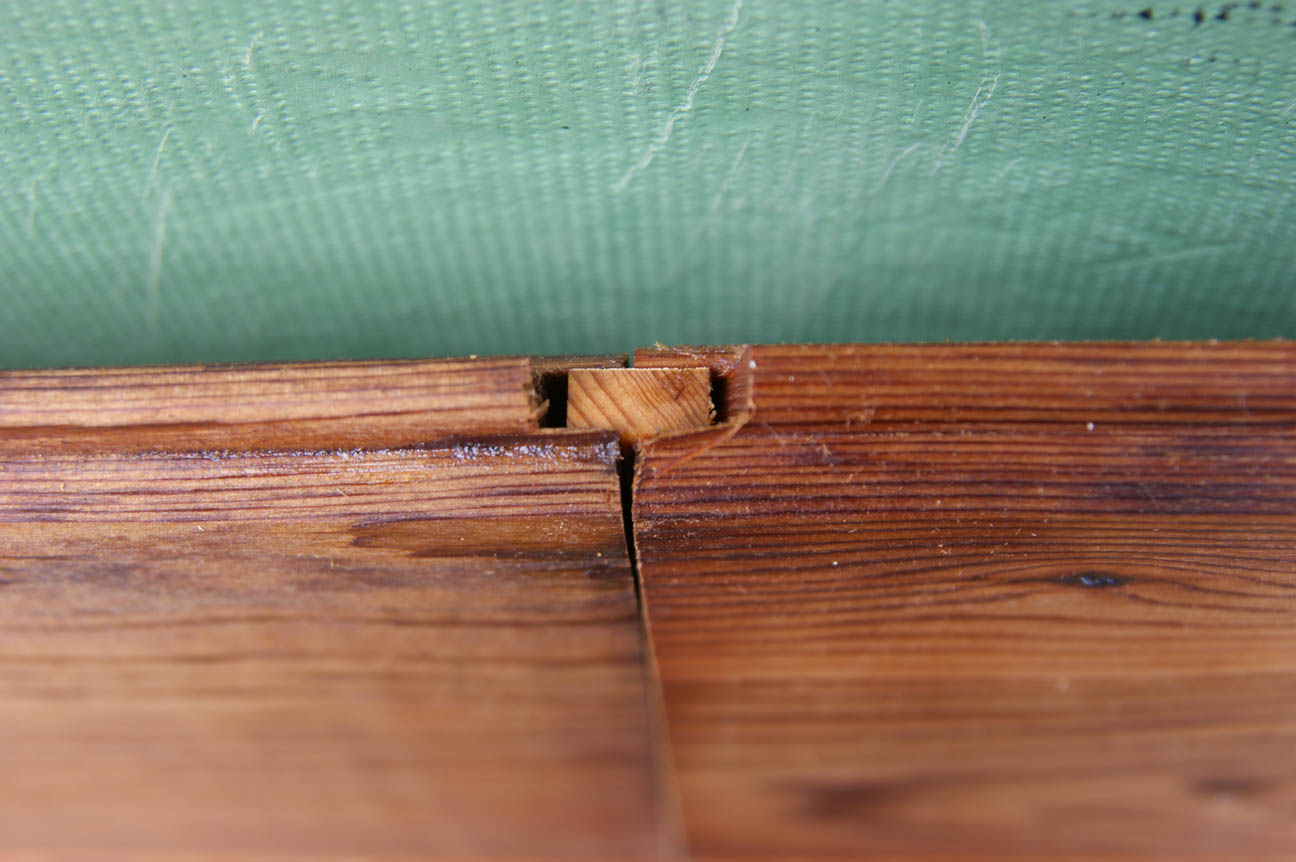 Spline inserted at the butt joint of two tongue and groove red cedar siding boards