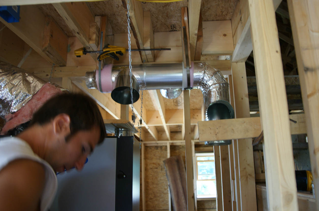 Throughout the last week I have been plugging away at the duct work for the HRV (Heat recovery ventilator). For those who don’t know, a HRV is a ventilation device that passes stale exhaust air from the house by fresh exterior air thus exchanging the heat from the exhaust to the fresh air. Best practices call for exhaust registers to be in the bathrooms and kitchen, while supply registers to be in the living spaces and bedrooms. When installing the exterior vent shrouds, one should place them at least 6′ apart so the two air flows don’t mix. Also, the shrouds should be on the same side of the house to avoid differential between air pressures.