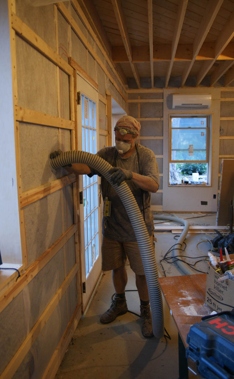 We have blown in the large majority of the insulation. This is really exciting because insulation is the foundation of an energy efficient home. The cellulose insulation that we are using is made locally in Belchertown by National Fiber. They use shredded and fluffed unread New York Times and Boston Globe newspapers. The cellulose is mixed with 17% borate which is a non-toxic fire-retardant and insect repellant. It also inhibits the growth of mold and mildew. Competitor’s use ammonia sulfate which is more toxic and less effective.