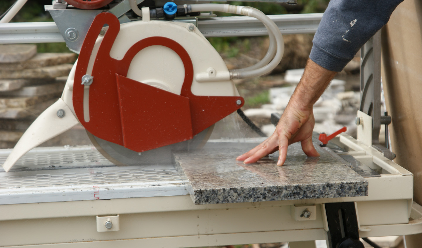 Using our wet cutting saw to cut granite counter top scrap