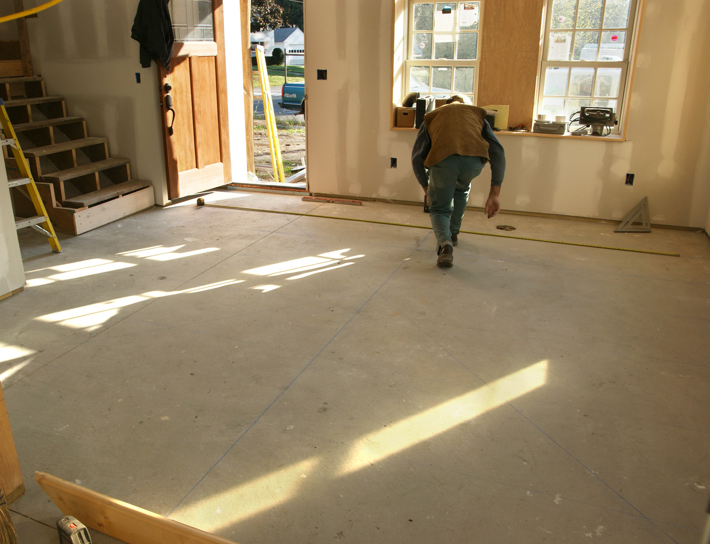 Laying out the chalk lines for the granite counter top scrap floor