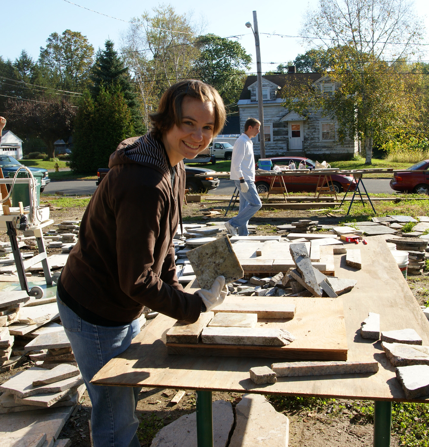 Sue assembling a square segment for the granite scrap floor
