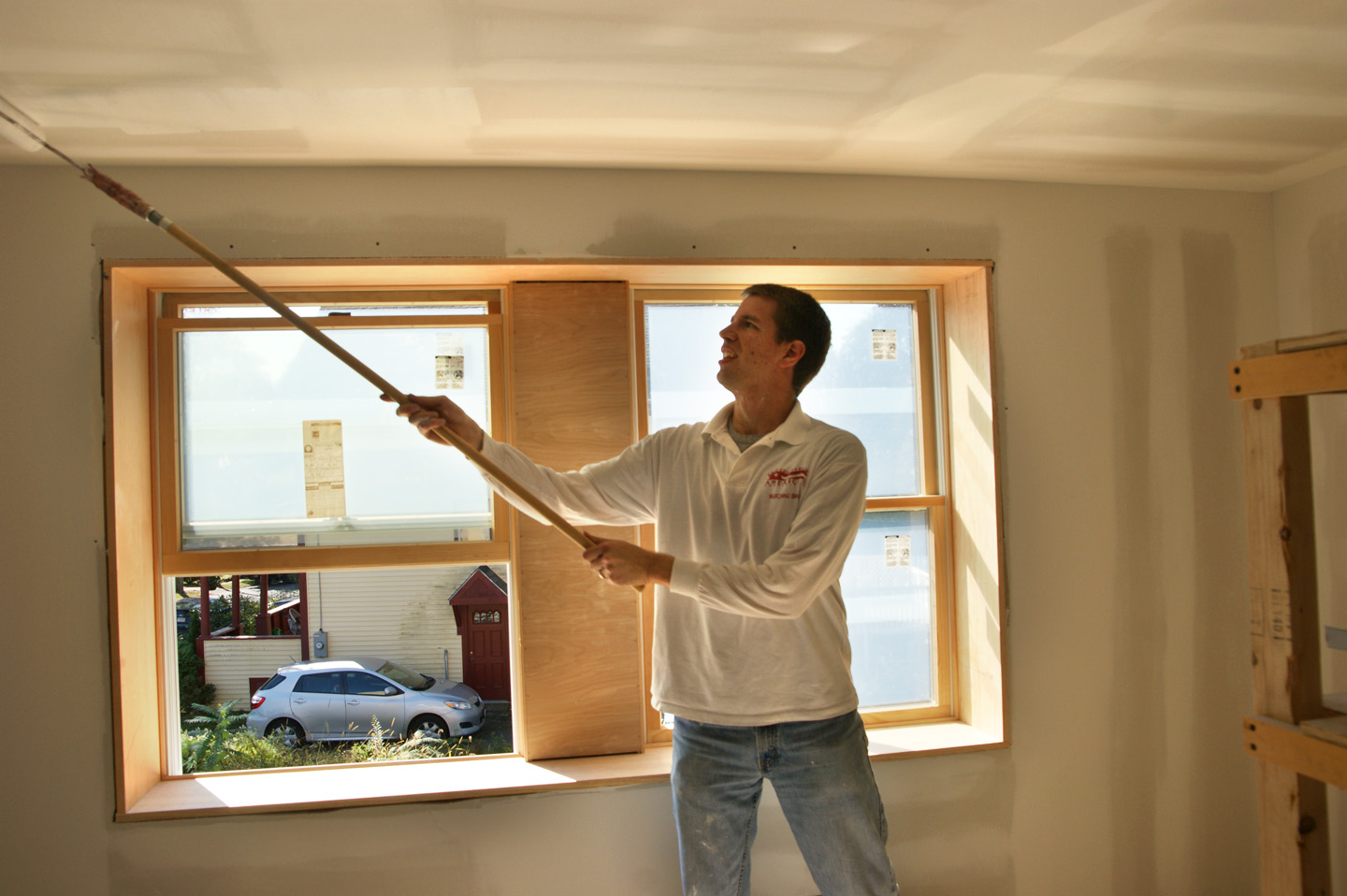 Tim priming the ceiling for the secondary bed room