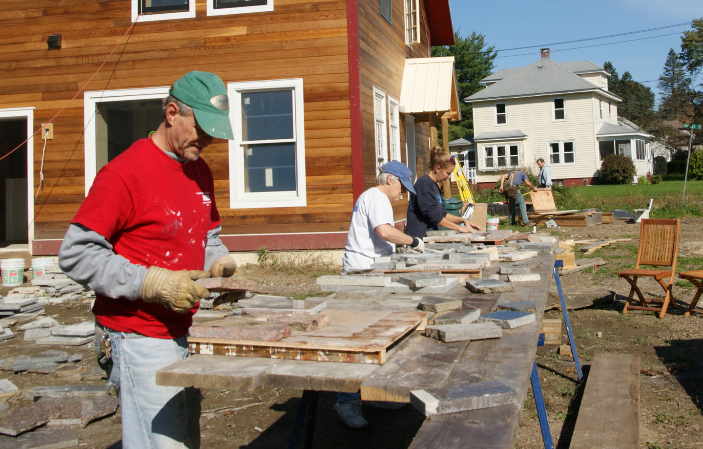 The work party from the second floor window. Our powerful tile saw is visible in the lower part of the image. It has a 12″ diamond blade and can slide 3′.