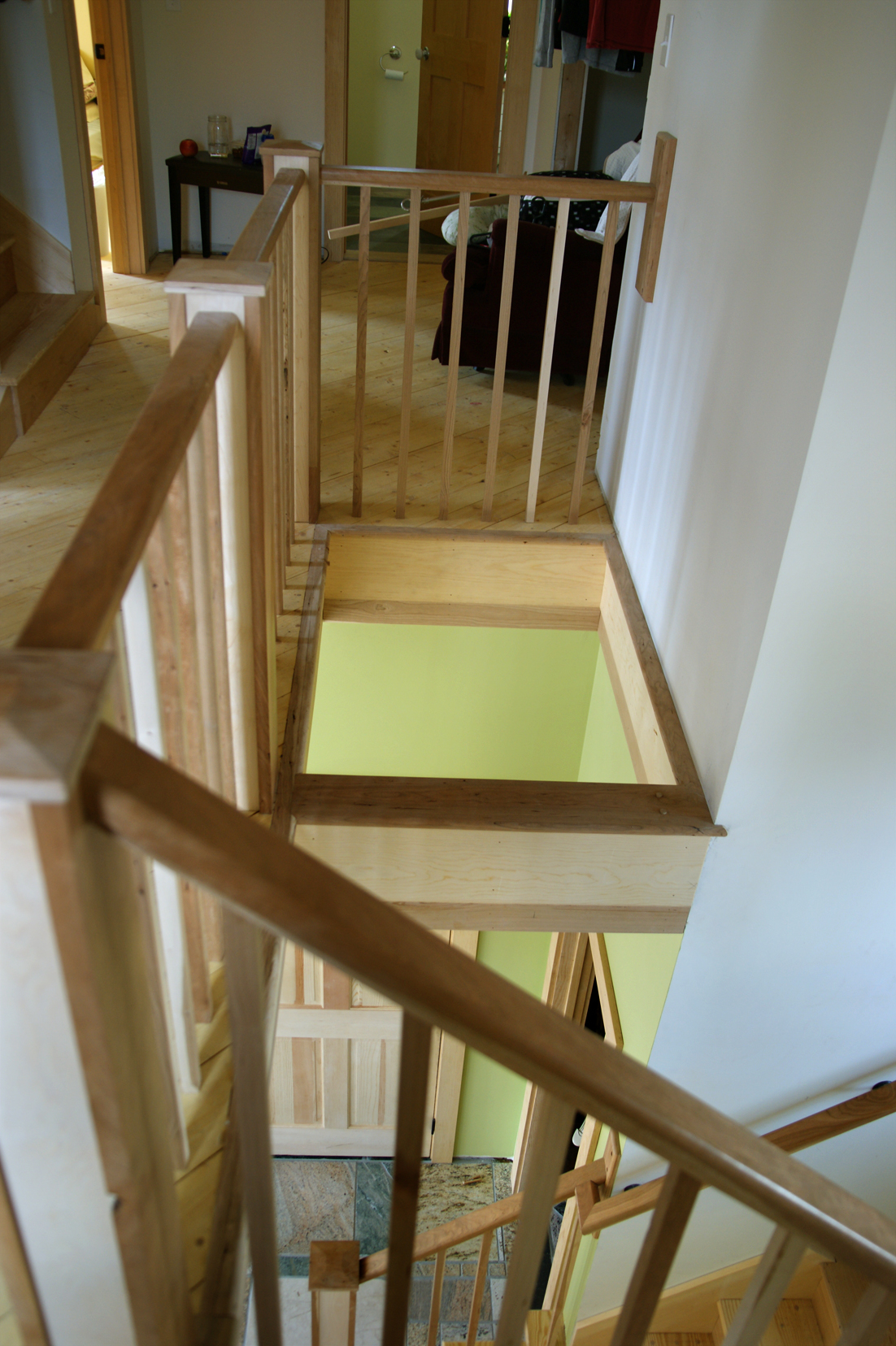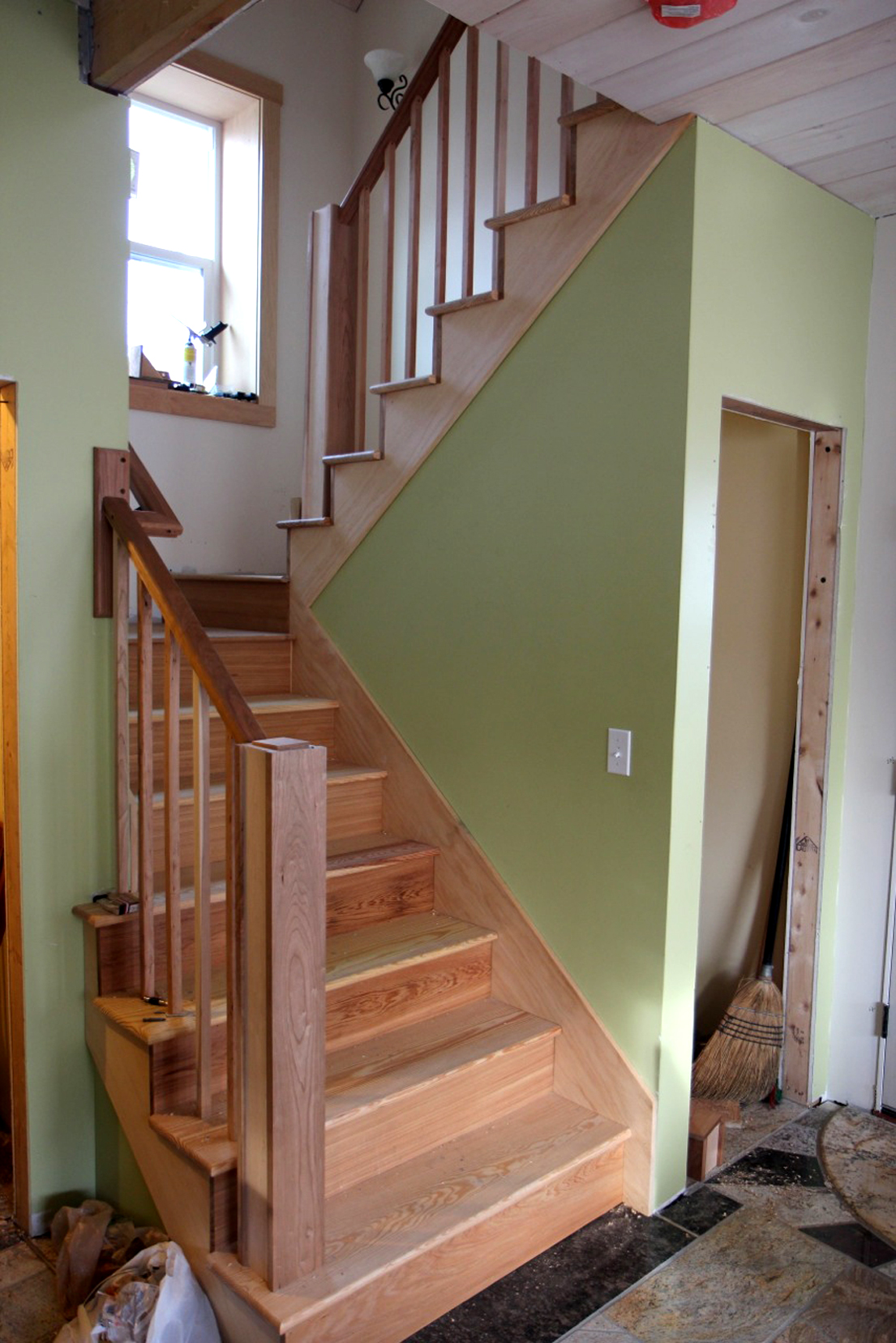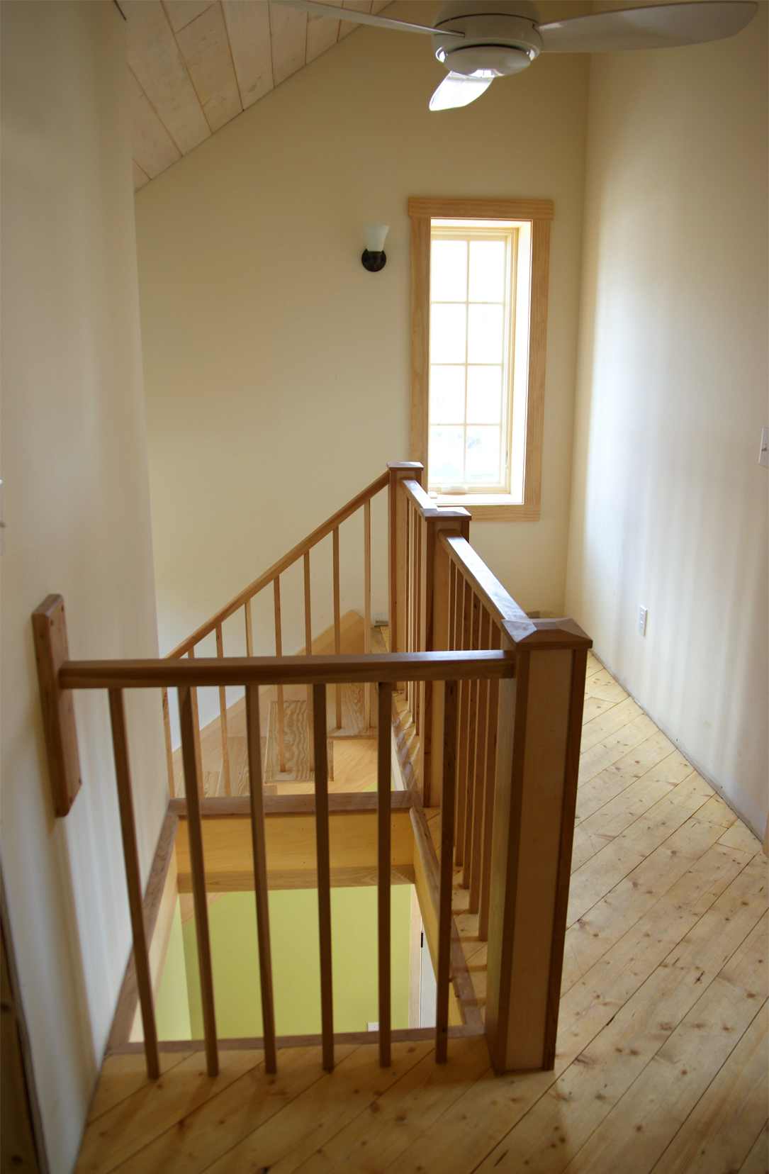 A view of the finished stairs looking from the top down to the landing. Adam put a tongue and groove on the recycled old growth wood used on the landing. Even though the boards were fairly tight to begin with, they shrunk some. Eighth inch gaps are visible between the boards. Perhaps they will close up this summer. (Photo by Andy Grant)