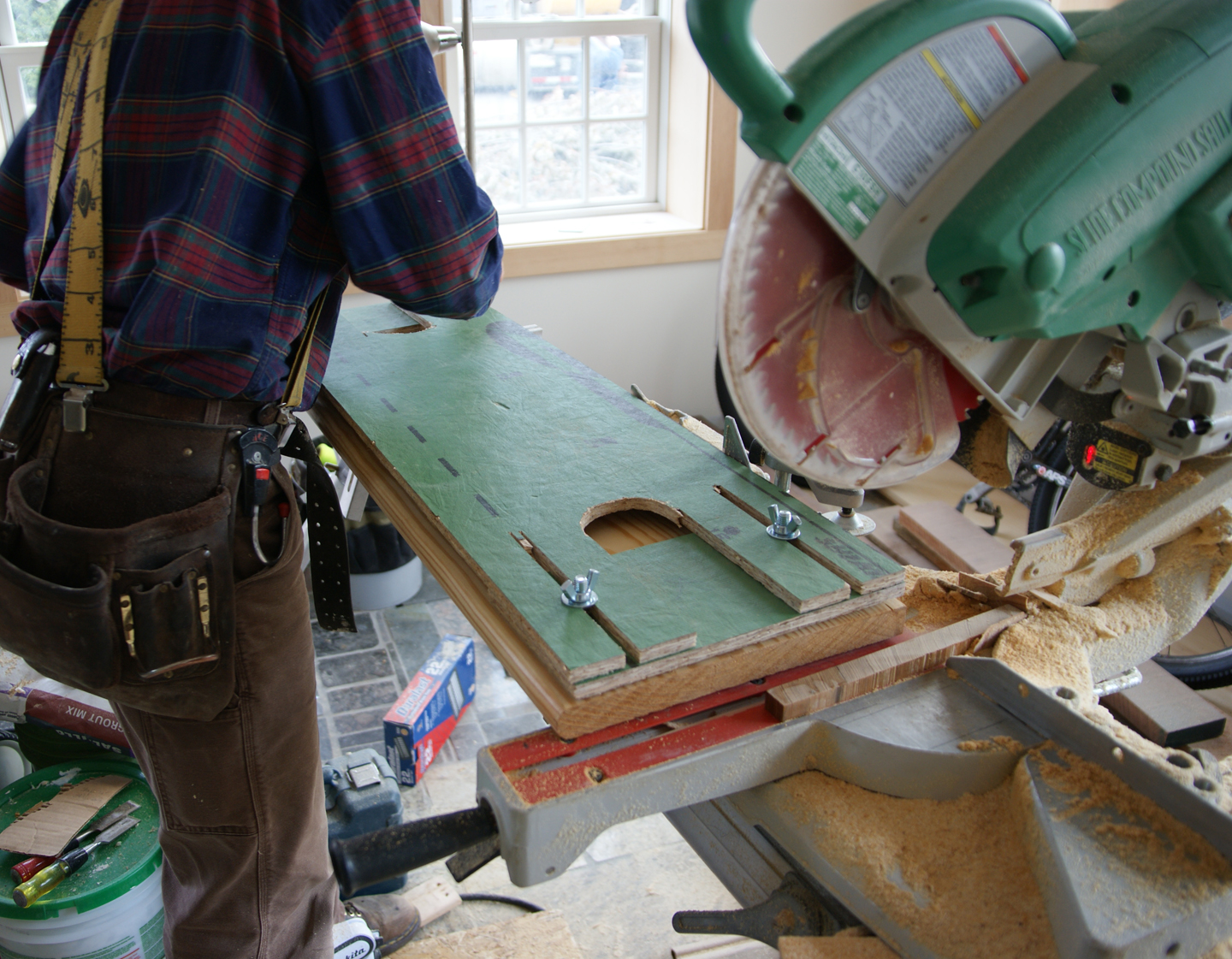 Our home made balusters are square in cross section. We put a round tenon on the end using a method inspired by the "For Pros by Pros Stairbuilding" book. The book recommends using a dado blade on a table saw. You set up a block of wood with a hole that has the same diameter as the diagonal of the square cross section of the baluster next to the dado blade. You then push the baluster through the hole into the dado blade and rotate it. In part because we only had a portable table saw on site, Adam created another style of jig for use with his router table. Basically, he clamped on a 6" section of plastic tubing (same inside diameter as the baluster's cross section diagonal) onto the table, and then pushed the baluster down onto the router.