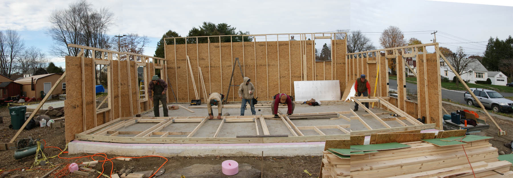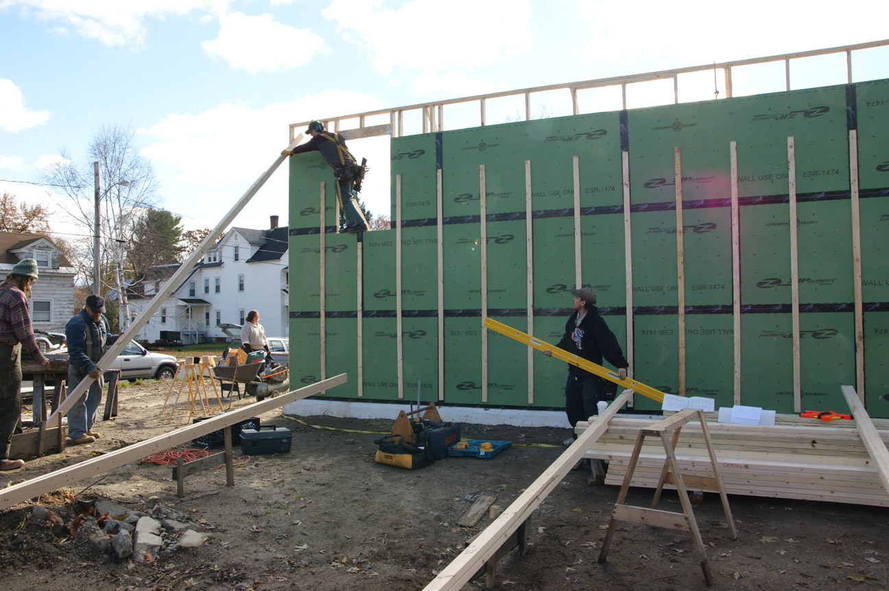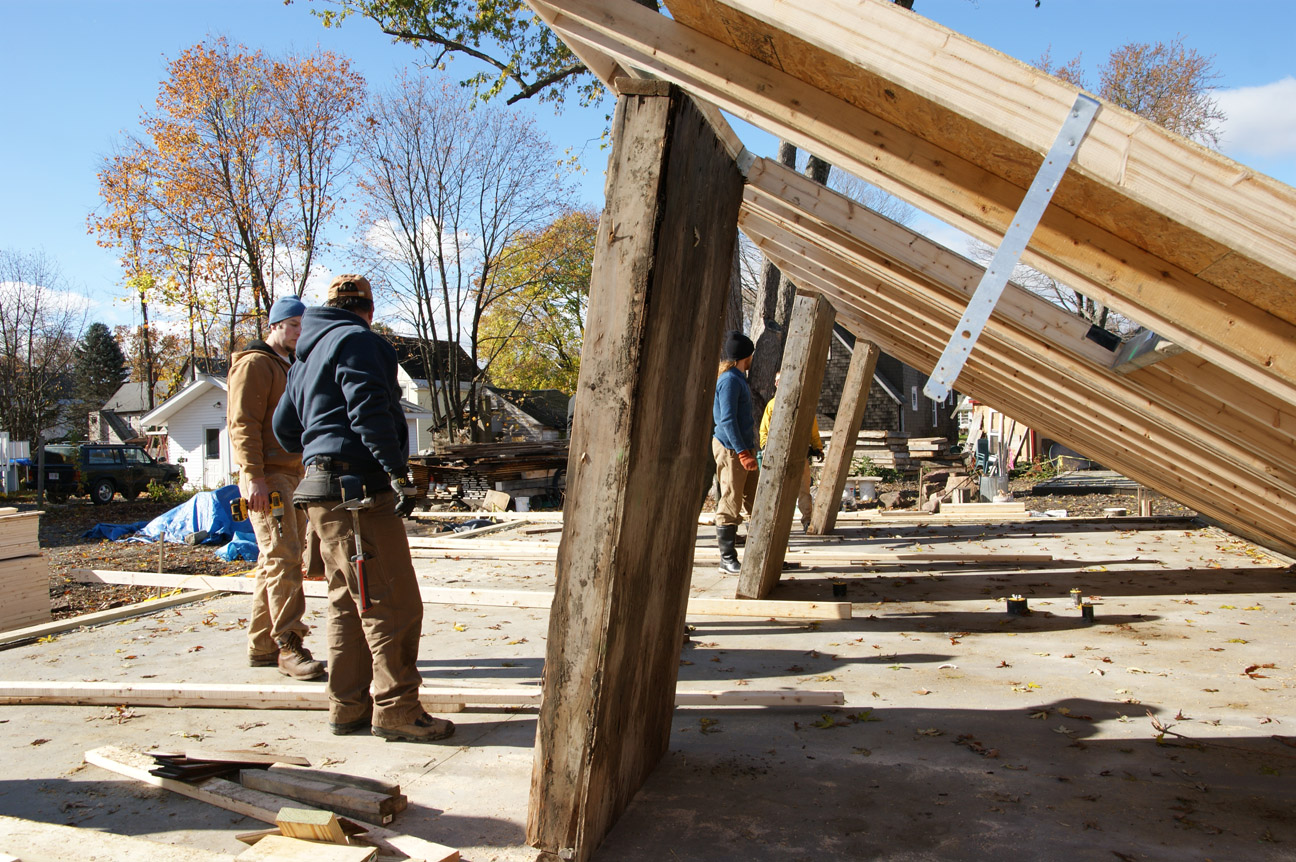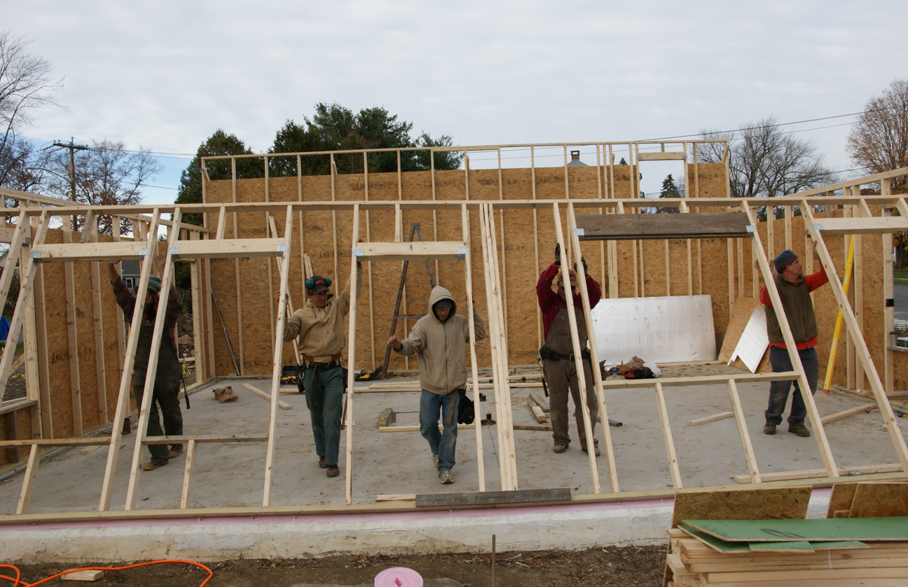 Hooray! Yesterday we had another very successful work party. With many hands on deck we raised the east gable wall, built the South 2nd floor wall, raised it, applied sheathing Zip tape to the areas between the floors, as well as finished a number of other jobs. Thank you to all who turned out: Eric, Craig, Brett, Whip, John, Gary, Darryl, Jason, and Terry. A special thanks to Adam, for leading us safely through the exterior wall raising process.