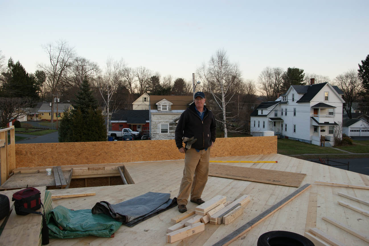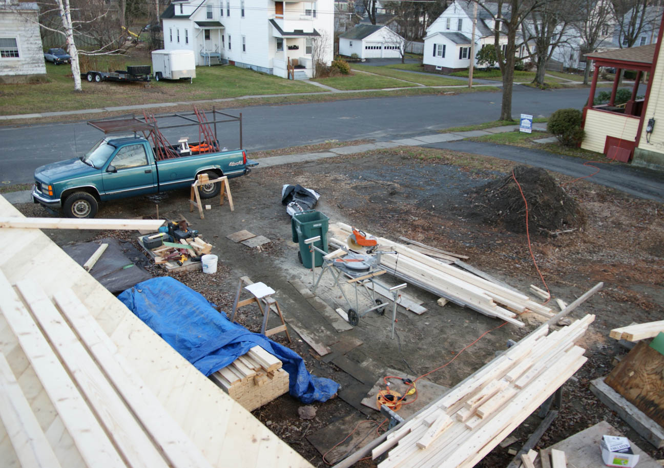 View from the east peak looking straight down. The house is just under 30′ tall at the peak. (Pic. by Adam)