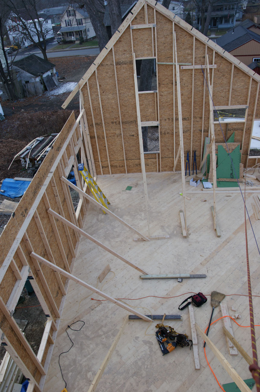 The second floor gable walls are balloon framed. There will be a ledger installed south of the transom window to catch the east-west joists. There will be a load bearing wall half way between the gables. Just visible is a bit of the north wall which is balloon framed from the first floor. More sheathing will be added and will be similarly notched to accommodate the rafter tails from the trusses. Also worth pointing out are the notches on the top of the gable wall top plate. This will be where the “lookouts” will be installed. We have a 2′ overhang on the gables of the house; the lookouts are the framing member that provides structural support for the overhang. The 4′ lookouts will attached to the first truss with structural screws.