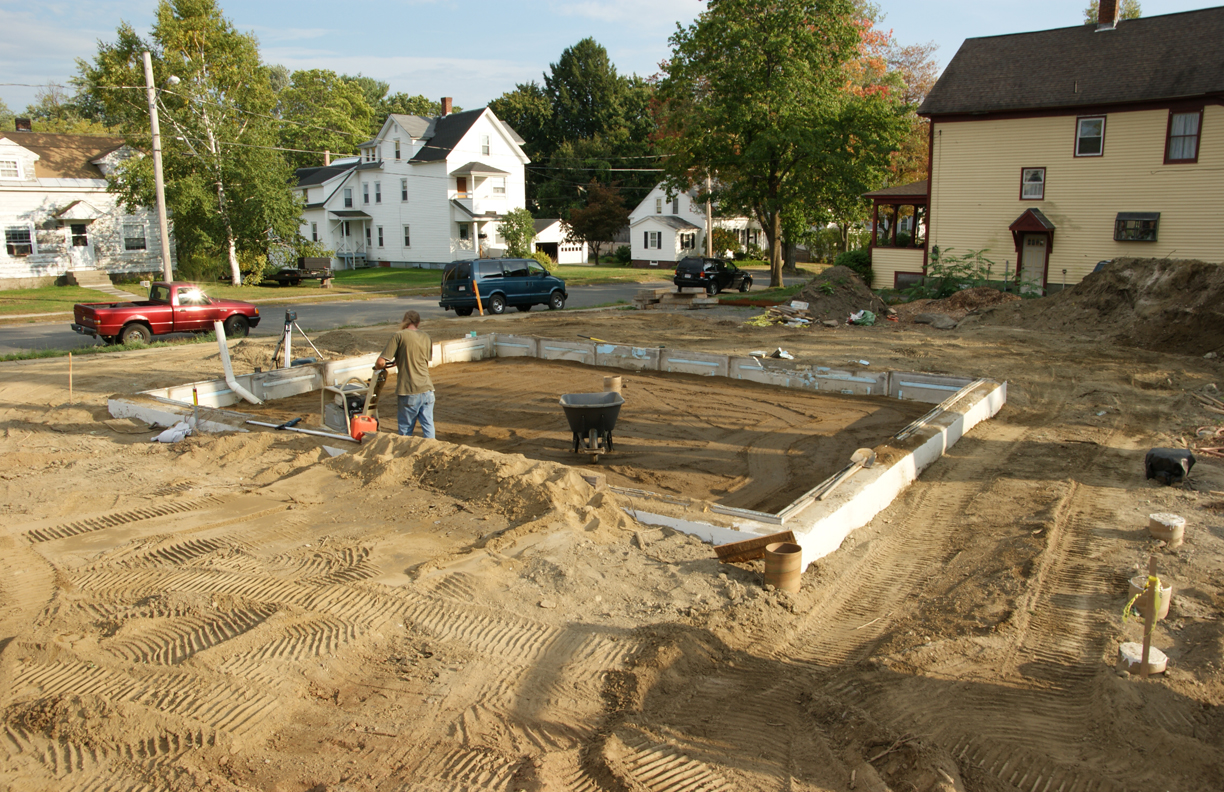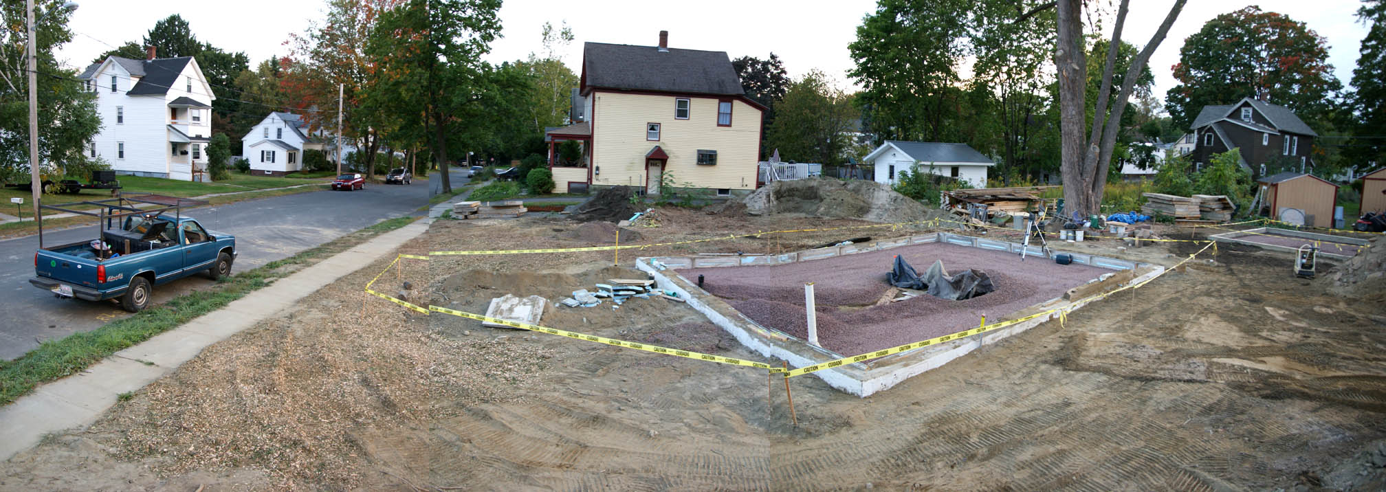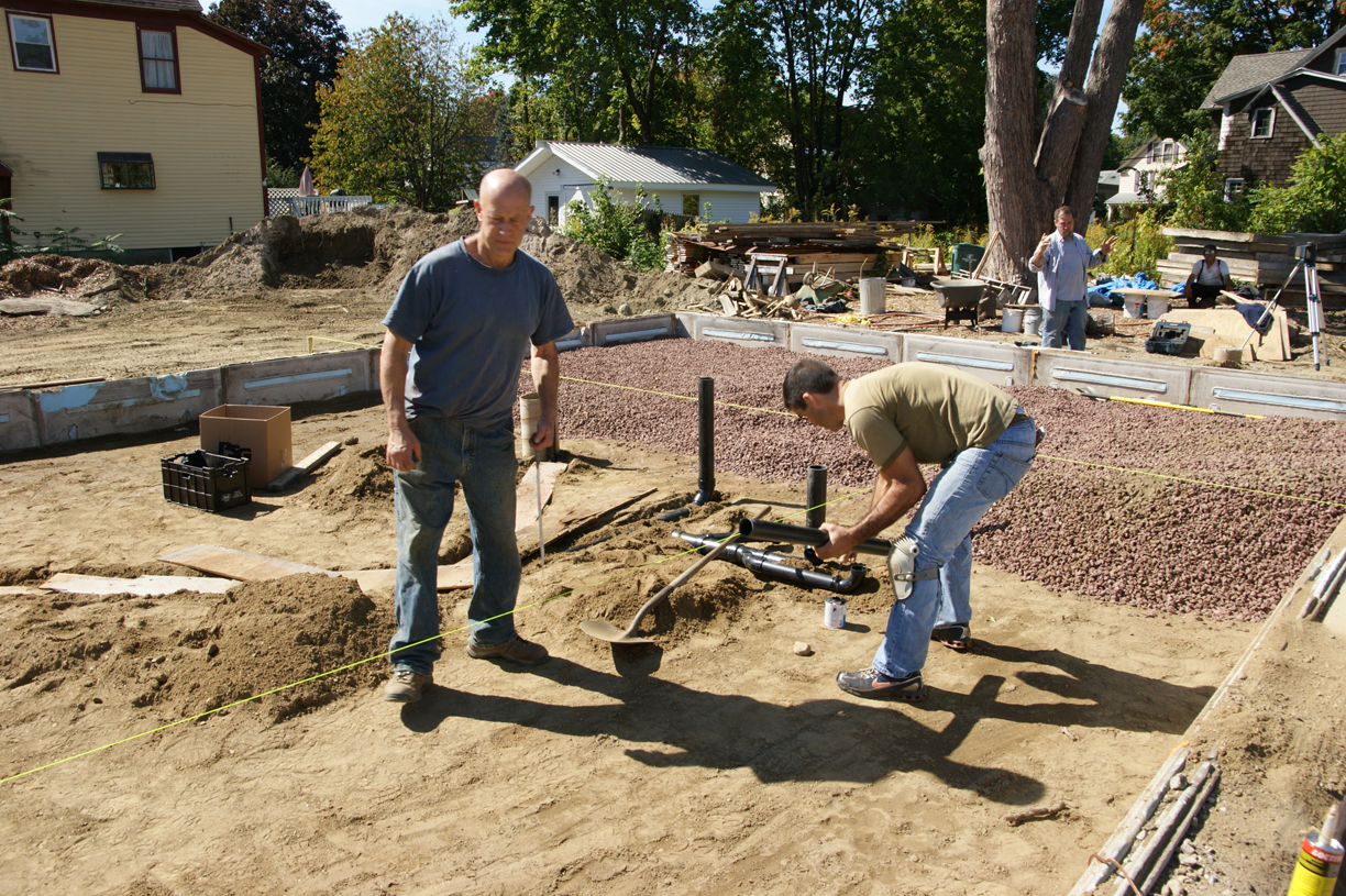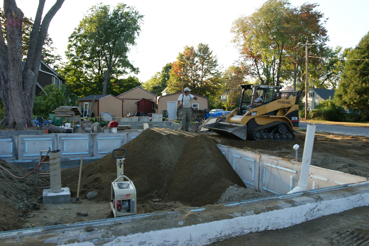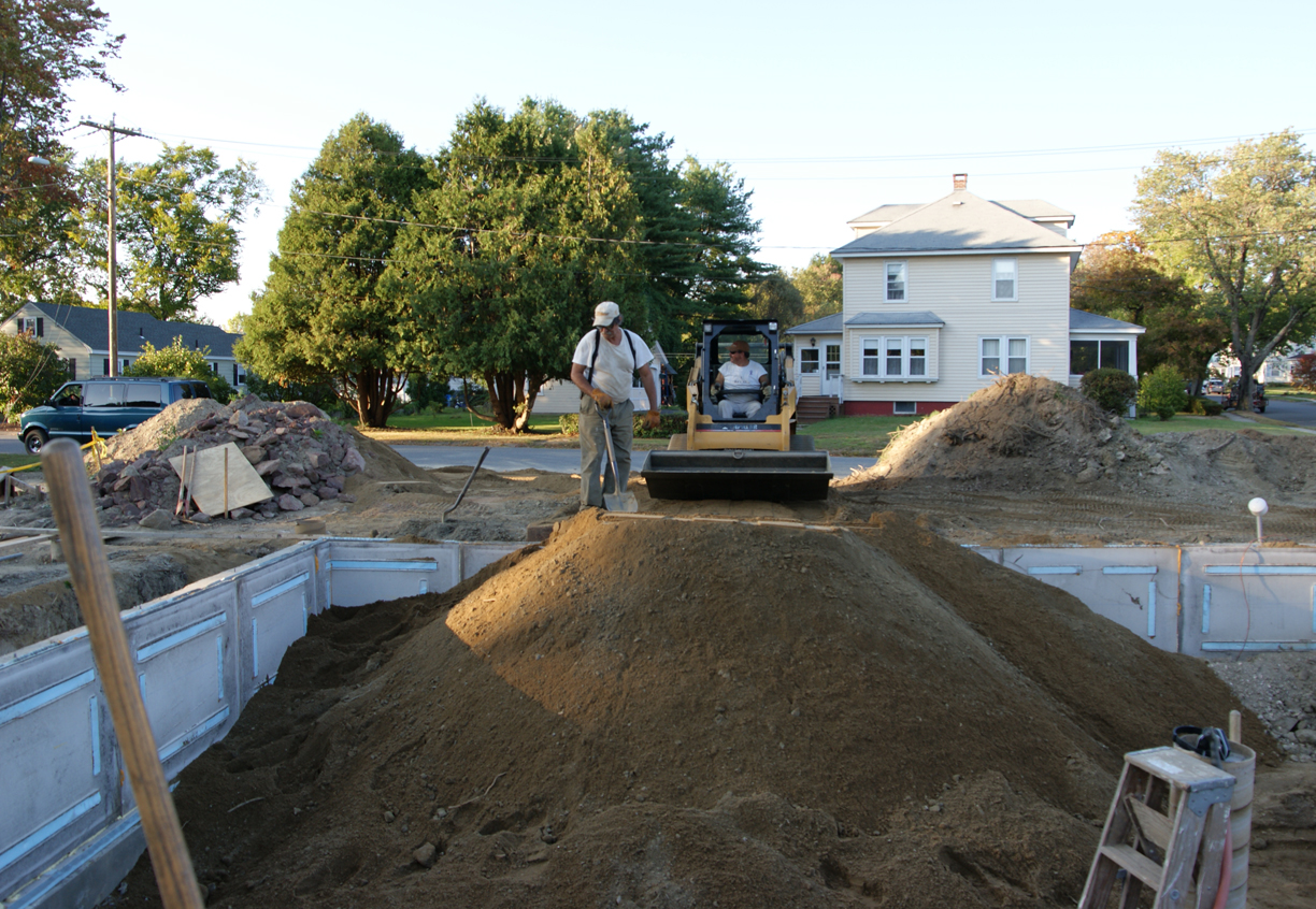 On Tuesday I was able to get the appropriate parging material from Shanahan’s Construction Supply in Turner’s Falls. It wasn’t cheap though: $33/50# bag. Due to the cost, I decided we would only use the surface bond cement where we needed to: the seams and corners where the foam is exposed. By code, this serves as our termite barrier. If we had covered the entire surface, then the parging would act as the necessary damp/water-proofing surface, however, I decided it would be cheaper to apply UGL Drylok or a similar paintable compound. It was such a relief to apply the surface bond cement compared to the mix that Devin and I created. It went right on without any difficulty. Thom and I were able to finish the rest of the parging in time for lunch.